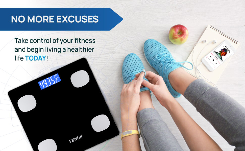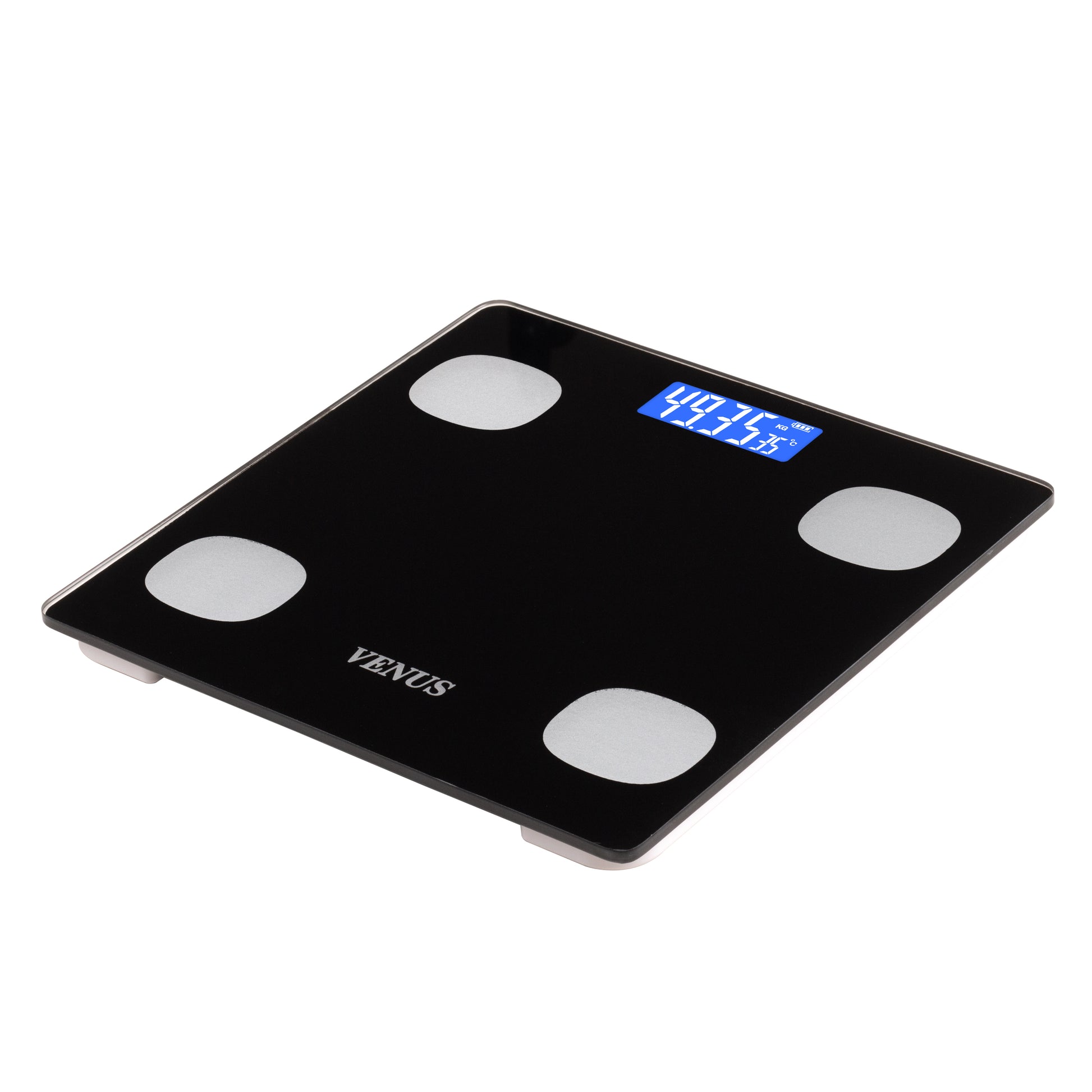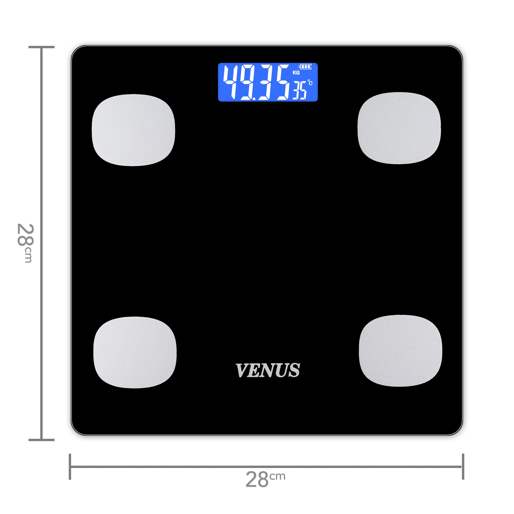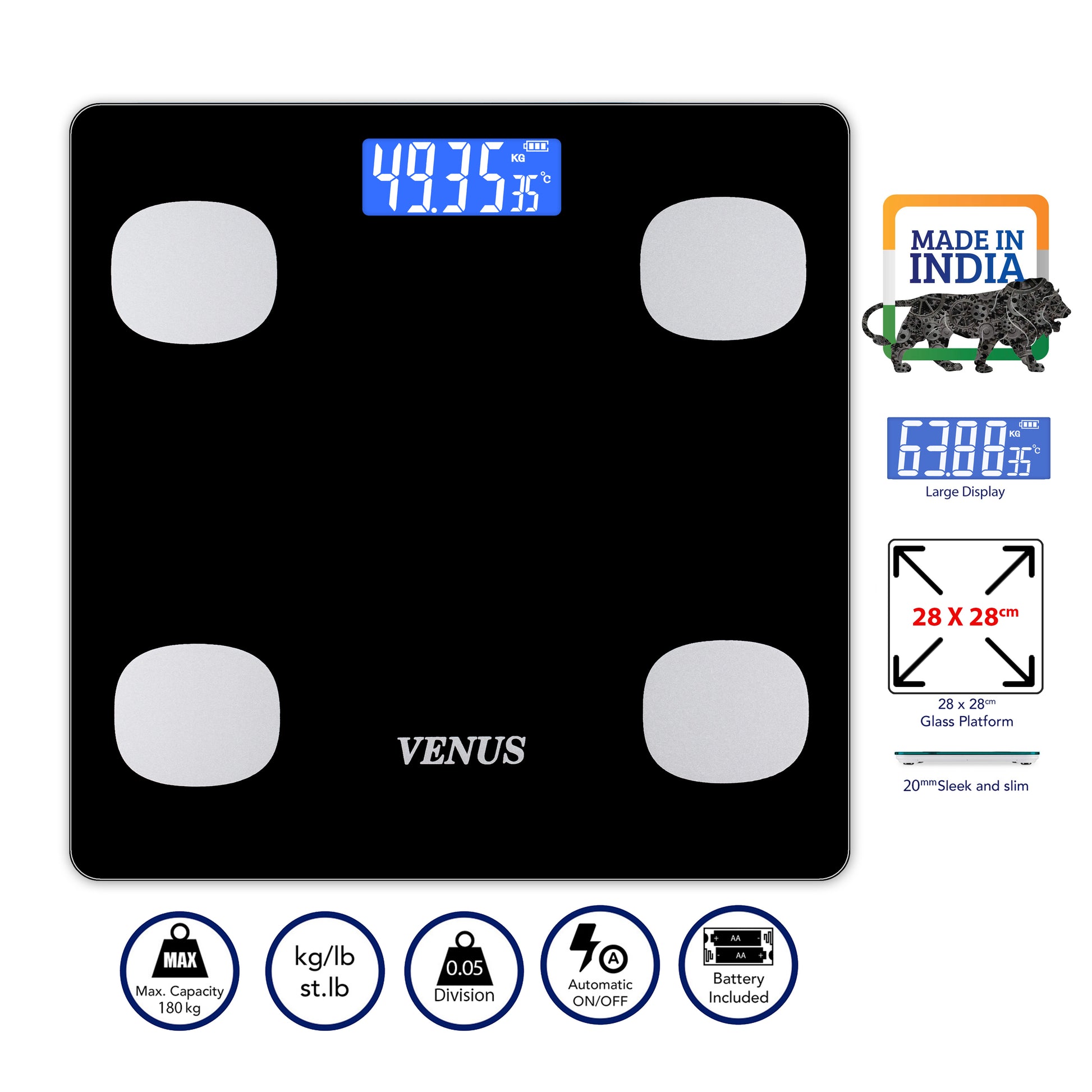 వీనస్ (భారతదేశంలో తయారు చేయబడింది) BMI వెయిట్ స్కేల్ & బాడీ ఫ్యాట్ ఎనలైజర్ (IOS/ఆండ్రాయిడ్ యాప్ సింక్ తో), 25+ కోర్ ఎసెన్షియల్ కంపోజిషన్ మెట్రిక్స్ గల బరువు చూసే యంత్రం, గృహ ఆరోగ్య పర్యవేక్షణకు (నలుపు)